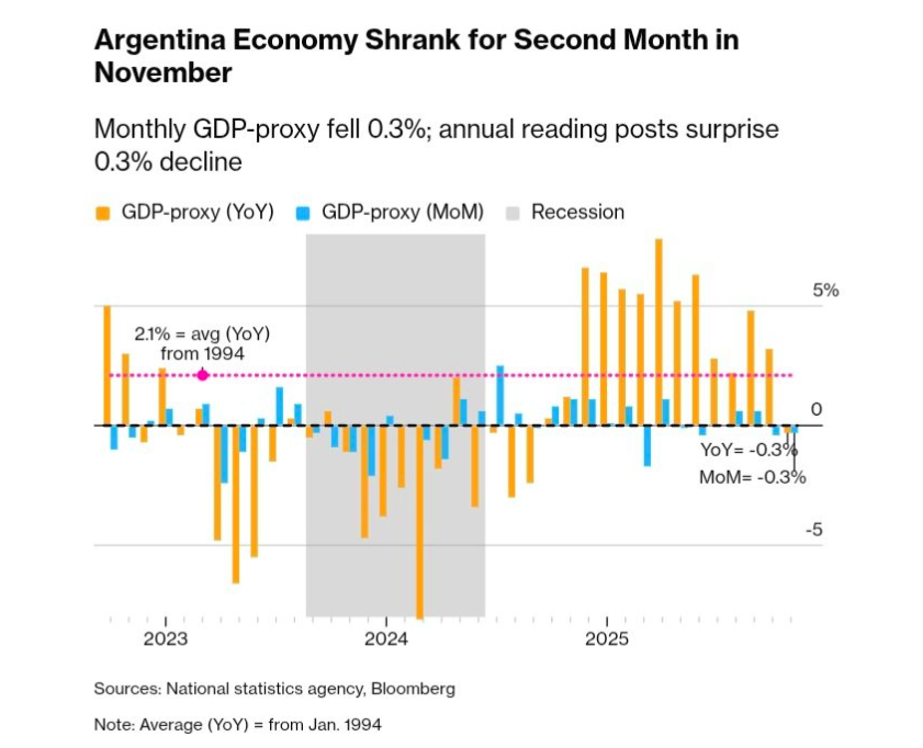 Os dados oficiais mais recentes reforçam esse diagnóstico. A economia argentina contraiu pelo segundo mês consecutivo em novembro, após uma eleição legislativa de meio de mandato marcada por forte turbulência política e financeira. A atividade econômica recuou 0,3% em relação a outubro, informou nesta quarta-feira o instituto oficial de estatísticas, o INDEC, depois de uma queda de 0,4% registrada no próprio mês de outubro. Na comparação com novembro do ano anterior, a retração também foi de 0,3%, resultado muito abaixo da estimativa mediana de crescimento de 2% projetada por economistas ouvidos pela Bloomberg.