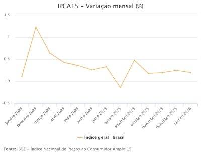 Com o resultado do primeiro mês de 2026, o Índice Nacional de Preços ao Consumidor Amplo 15 (IPCA-15) acumula 4,5% em 12 meses, limite máximo da meta de inflação do governo. Em dezembro, o acumulado era 4,41%.