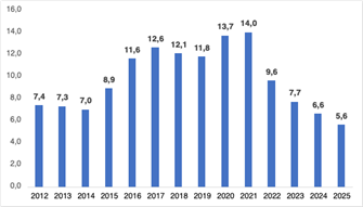 Com o resultado de dezembro, a taxa anual do indicador de desemprego caiu de 6,6%, em 2024, para 5,6%, em 2025, patamar mais baixo desde 2012. Em um ano, a média de pessoas desocupadas caiu de 7,2 para 6,2 milhões. Em razão da pandemia de Covid 19, nos anos 2020 e 2021 a taxa chegou a 13,7% e 14,0%, e cerca de 14 milhões de desocupados. Os dados são da Pesquisa Nacional por Amostra de Domicílios Contínua (Pnad Contínua), divulgada hoje (30) pelo IBGE.
