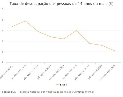 No trimestre encerrado em dezembro, a taxa de desocupação do país caiu a 5,1%, nível mais baixo da série histórica iniciada em 2012, quando foi de 8,0%. Isso significa que cerca de 5,5 milhões de pessoas tentaram encontrar um emprego nos três últimos meses do ano e integrar a população ocupada, que totalizava 103 milhões de pessoas.