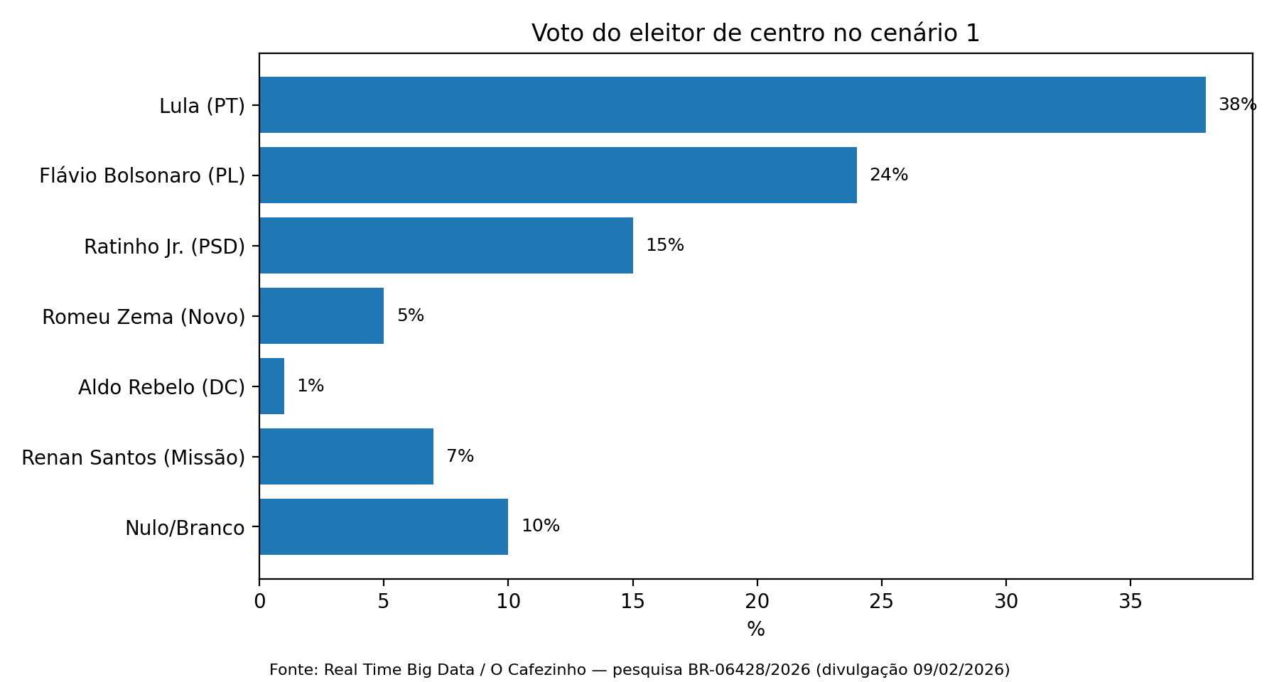 No cenário 1 da pesquisa Real Time Big Data, quando o voto é separado por identidade ideológica, o recorte mais decisivo aparece entre os eleitores que se autodefinem como centro. Nesse grupo, Lula lidera isoladamente com 38%, enquanto Flávio Bolsonaro tem 24% e Ratinho Jr. 15%. O voto da direita, portanto, chega fraturado ao eleitor de centro: somados, Flávio (24%) e Ratinho (15%) alcançam 39%, praticamente o mesmo patamar de Lula nesse segmento.