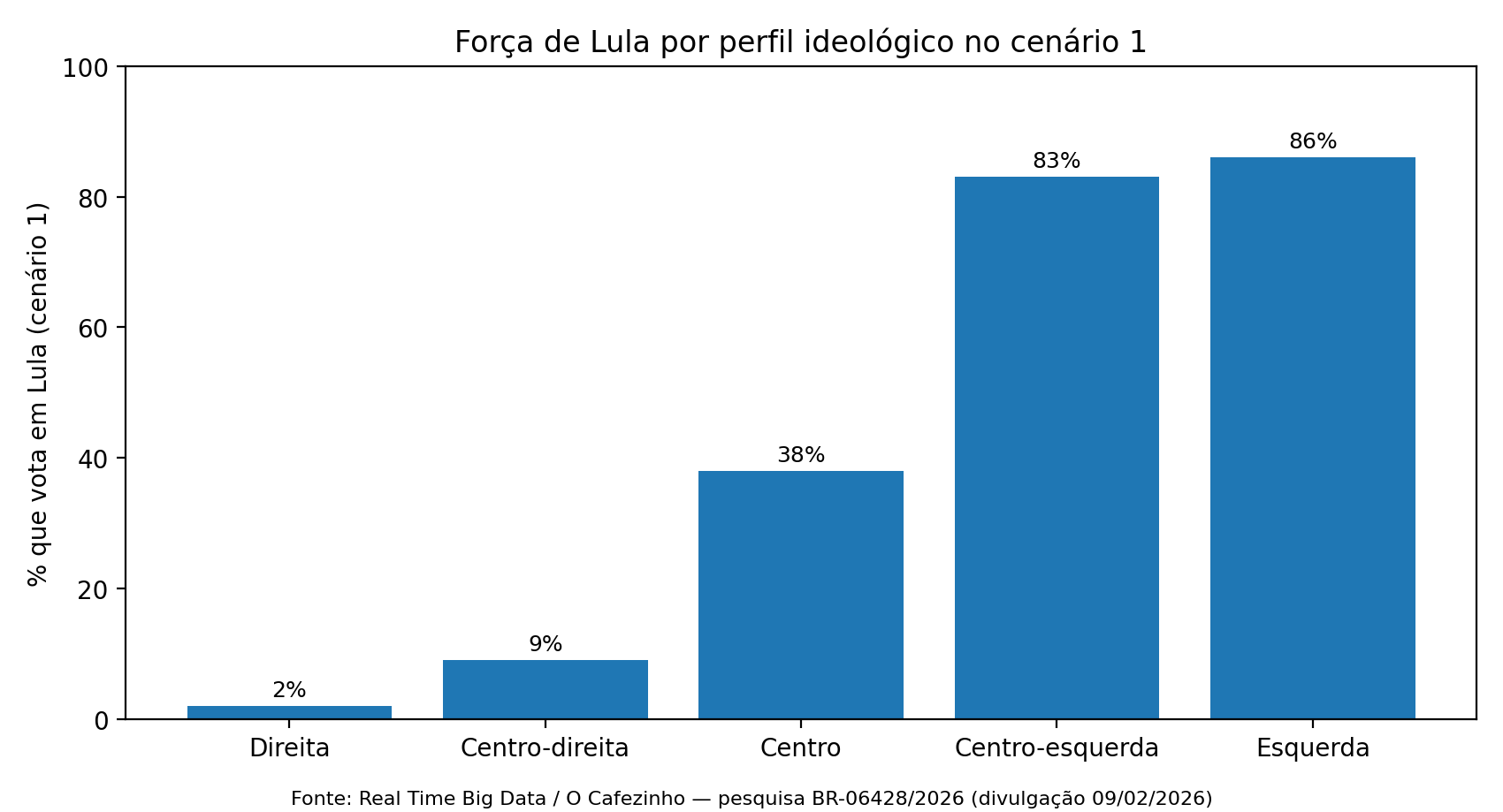 Nos extremos, o levantamento registra hegemonias claras: Flávio domina o campo da direita; Lula, o da esquerda, com patamares acima de 80% nos recortes de centro-esquerda e esquerda do cenário 1.