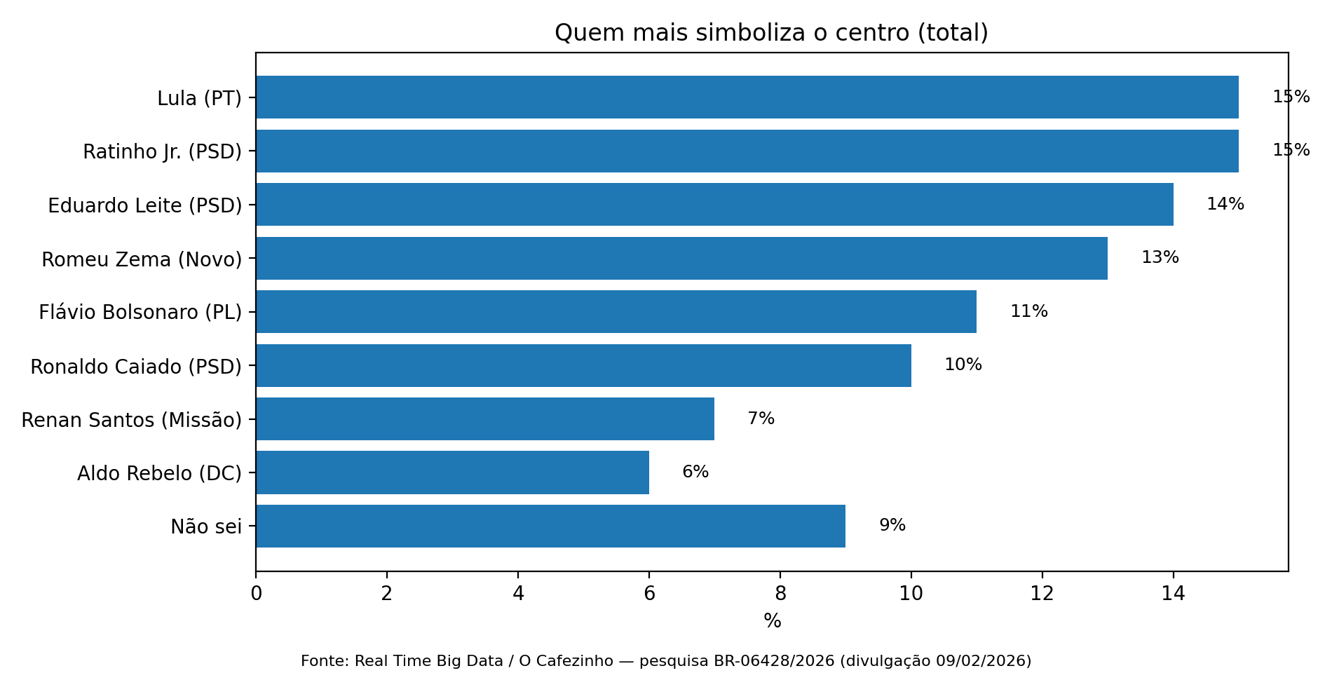 Além do bom desempenho no voto do segmento de centro, a pesquisa mede a disputa simbólica por esse campo. Na pergunta “quem mais simboliza o centro?”, a resposta aparece pulverizada: Lula (15%) e Ratinho Jr. (15%) empatam no topo; Eduardo Leite tem 14%, Romeu Zema 13%, Flávio Bolsonaro 11%, Caiado 10% e “não sei” 9%. O centro, portanto, não está “carimbado” em um único nome — e Lula figura como uma das referências nesse terreno.