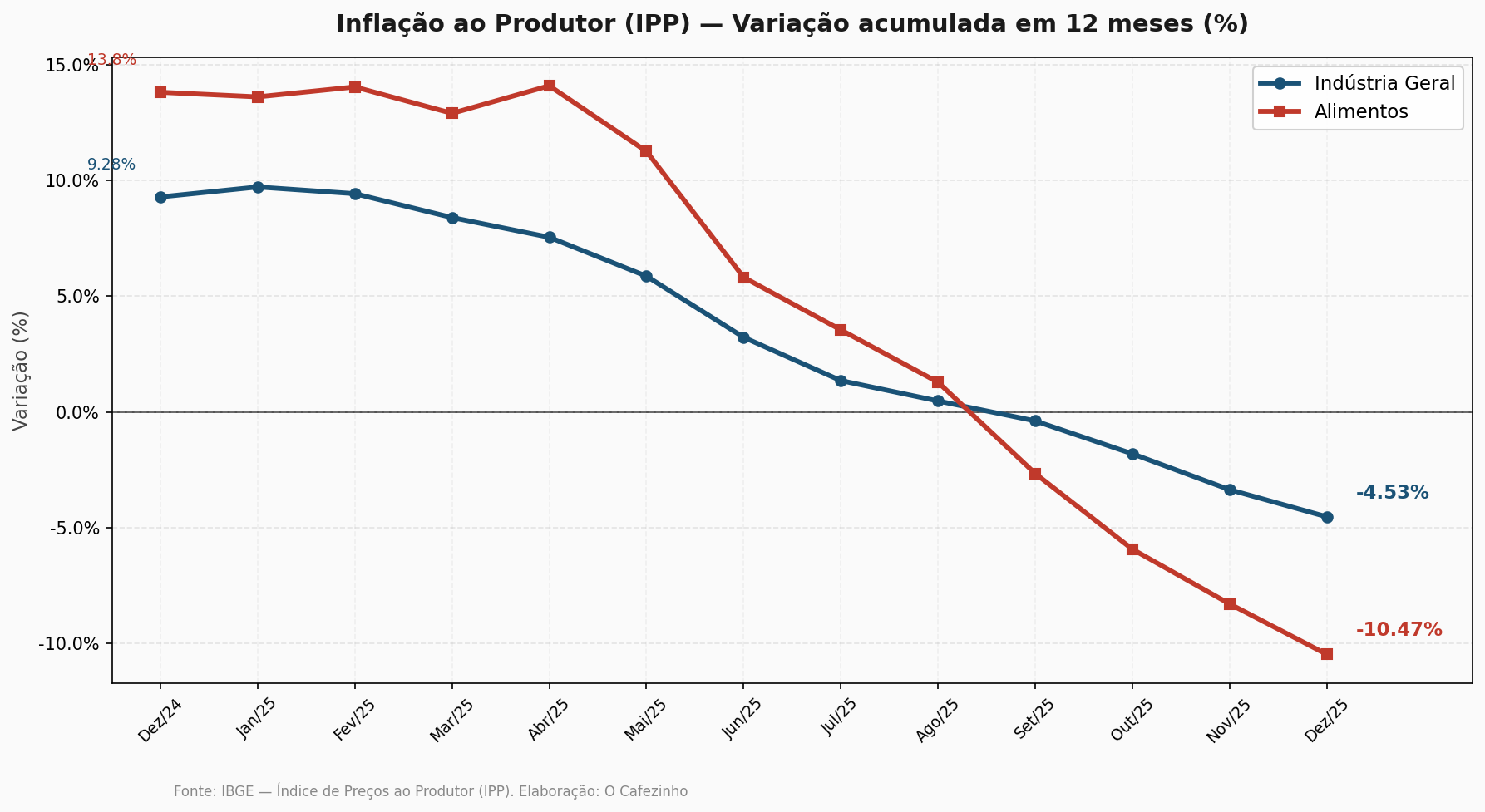 O gráfico acima ilustra a trajetória impressionante do IPP ao longo de 2025. A linha da indústria geral (azul) saiu de +9,28% em dezembro de 2024 para -4,53% em dezembro de 2025. A linha dos alimentos (vermelha) foi ainda mais acentuada: de +13,8% para -10,47%.