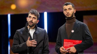Cineastas Yuval Abraham e Basel Adra foram acusados de antissemitismo por seu discurso de aceitação do prêmio de melhor documentário no Festival de Berlim | Monika Skolimowska/dpa/picture alliance