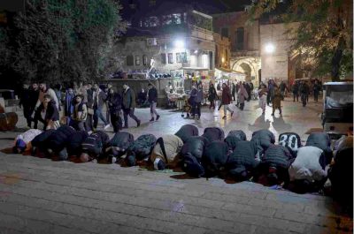Fiéis palestinos realizam orações na noite de quarta-feira ao lado da entrada da mesquita de Al-Aqsa, após terem sido impedidos de entrar. | Atef Safadi/EPA