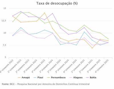 A taxa de desocupação no quarto trimestre de 2025 foi de 5,1%, o que representa uma redução de 0,5 pontos percentuais em relação ao terceiro trimestre de 2025 (5,6%). A queda foi acompanhada por quatro regiões do país: Nordeste (de 7,8% para 7,1%), Sudeste (de 5,3% para 4,8%), Sul (de 3,4% para 3,1%) e Centro-Oeste (de 4,4% para 3,9%). Já a região Norte apresentou estabilidade. Nesse comparativo, a região Nordeste permaneceu registrando a maior taxa de desocupação entre todas as regiões (7,1%).