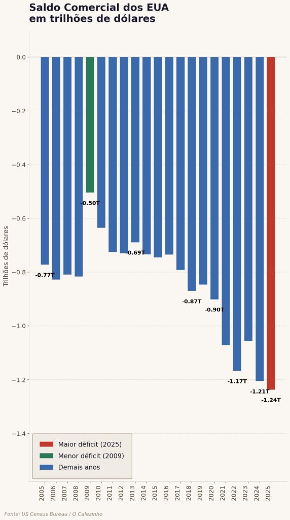 Os Estados Unidos terminaram 2025 com um déficit recorde no comércio de bens, contrariando a promessa de que tarifas resolveriam o saldo negativo crônico do país. Não resolveu, pelo menos até aqui.