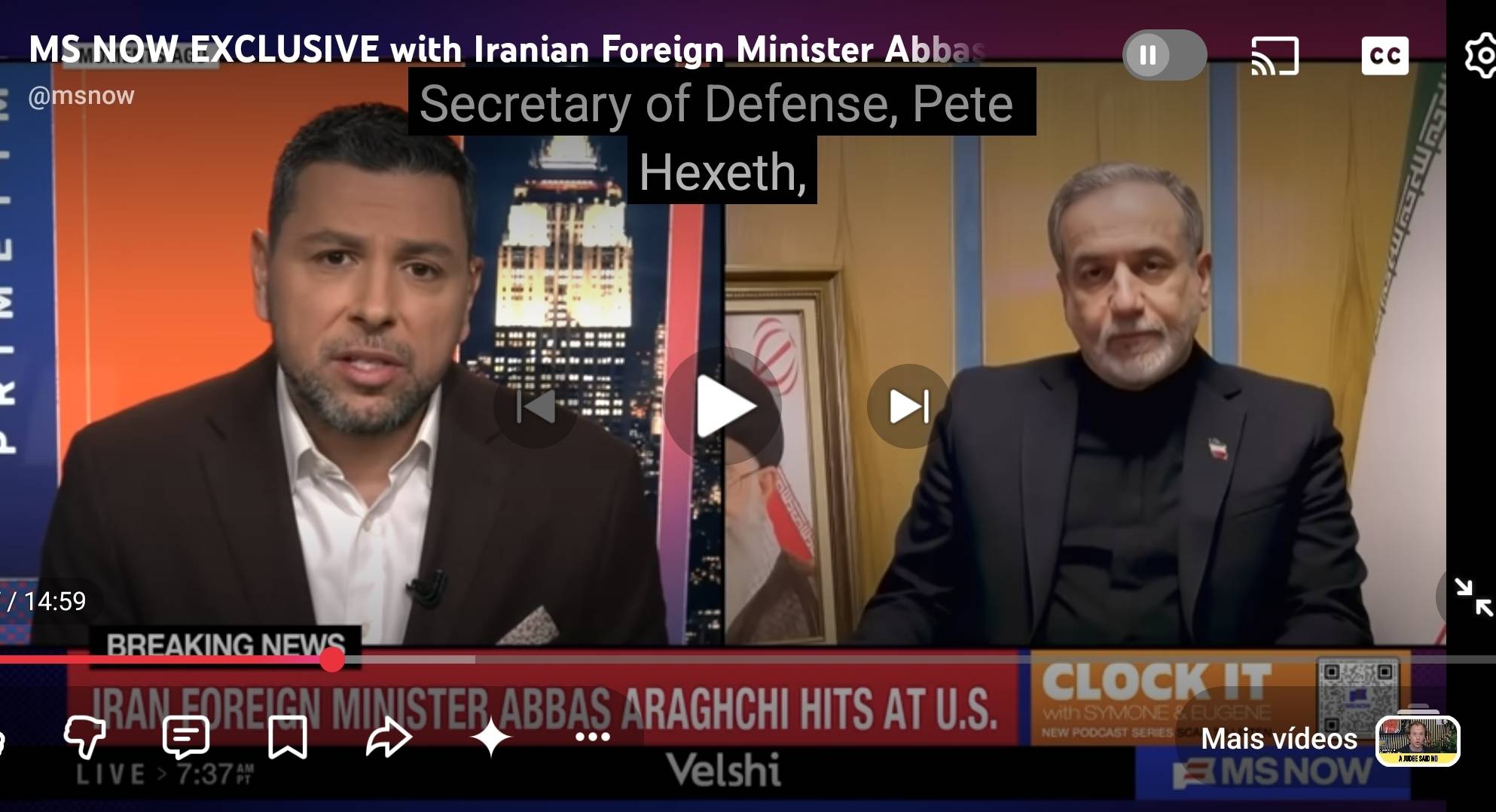 Durante a entrevista, o ministro insistiu que o conflito foi iniciado pelos Estados Unidos e por Israel, e que Teerã apenas reage a uma agressão externa.