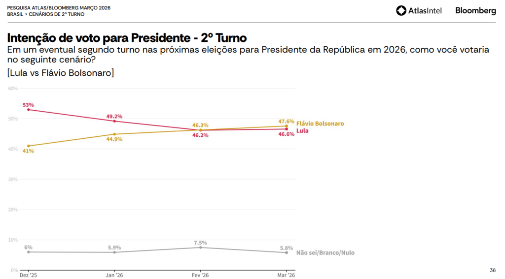 No segundo turno, Flávio Bolsonaro aparece com 47,6% contra 46,6% de Lula, configurando um empate técnico, mas com leve vantagem numérica para o senador. Em levantamentos mais recentes, essa diferença chegou a ser de apenas 1 ponto percentual a favor de Flávio, mantendo o cenário extremamente equilibrado.