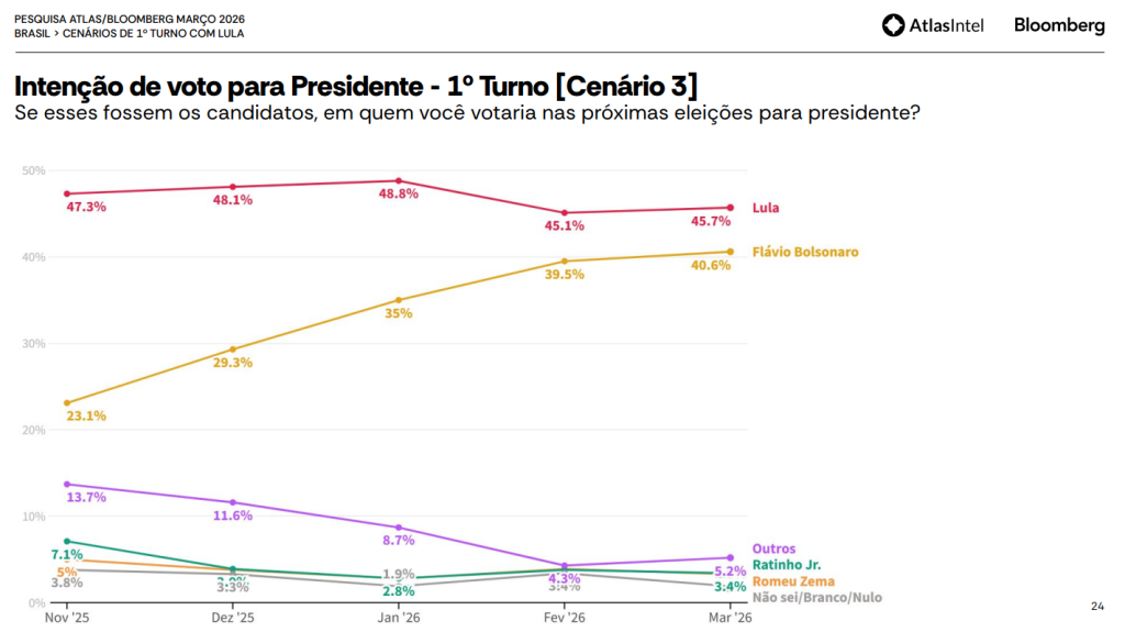 A nova pesquisa da Atlas/Intel divulgada pela Bloomberg acendeu um sinal que vai além da disputa eleitoral: pela primeira vez, Flávio Bolsonaro aparece numericamente à frente de Lula em um cenário pré-eleitoral, ainda que dentro da margem e em um contexto inicial de campanha.