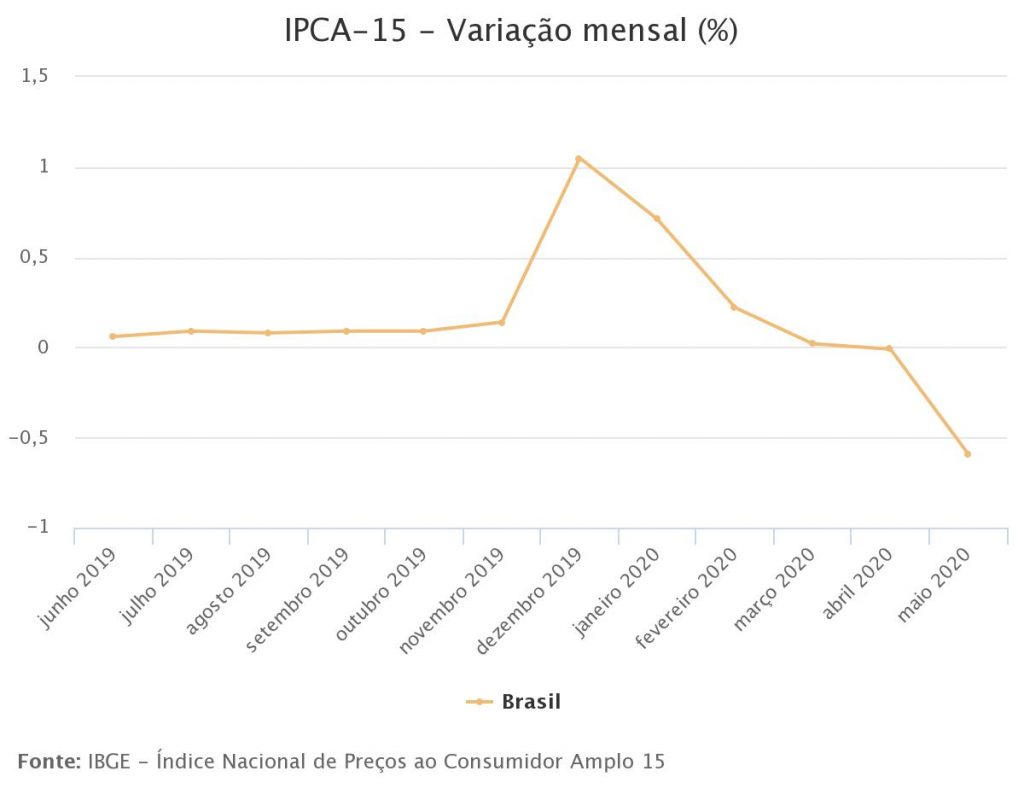 No ano, o IPCA-15 acumula alta de 0,35% e, em 12 meses, a variação acumulada foi de 1,96%, abaixo dos 2,92% registrados nos 12 meses imediatamente anteriores. Em maio de 2019, a taxa foi de 0,35%.