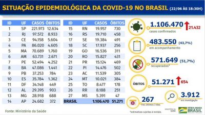 Agência Brasil — O Brasil teve 654 novas mortes por covid-19 registradas nas últimas 24 horas, de acordo com atualização do Ministério da Saúde divulgada hoje (22). Com esse acréscimo às estatísticas, o país chegou a 51.217 óbitos em função da pandemia do novo coronavírus.