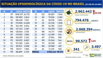O número acumulado de casos atingiu 2.962.442. Desde ontem, foram 50.230 novos casos informados pelas secretarias de saúde. A soma é 1,7% maior do que a registrada ontem pela atualização diária do Ministério da Saúde, quando o painel trazia 2.912.212 pessoas infectadas desde o início da pandemia.