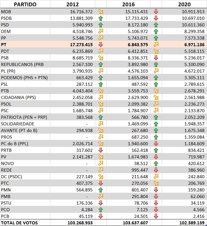 E se o PT, mesmo com abstenção recorde, repetiu a votação em torno de 7 milhões de votos, de 2016, sendo o sexto partido mais votado (PDT 5,5 milhões, PSB 5,0 milhões e PSOL 2,5 milhões), mesmo tendo eleito prefeitos em apenas 177 cidades e concorrendo em outras 15 das maiores cidades, no segundo turno, além de Belém e Porto Alegre como vice, como isso pode ser considerado um “desastre” e não ‘um terrível tsunami’, mesmo levando-se em conta a proteção e a divulgação positiva, incessantes, dispensadas pelo judiciário e a mídia, lavajateiros, ao mesmo, desde 2014?