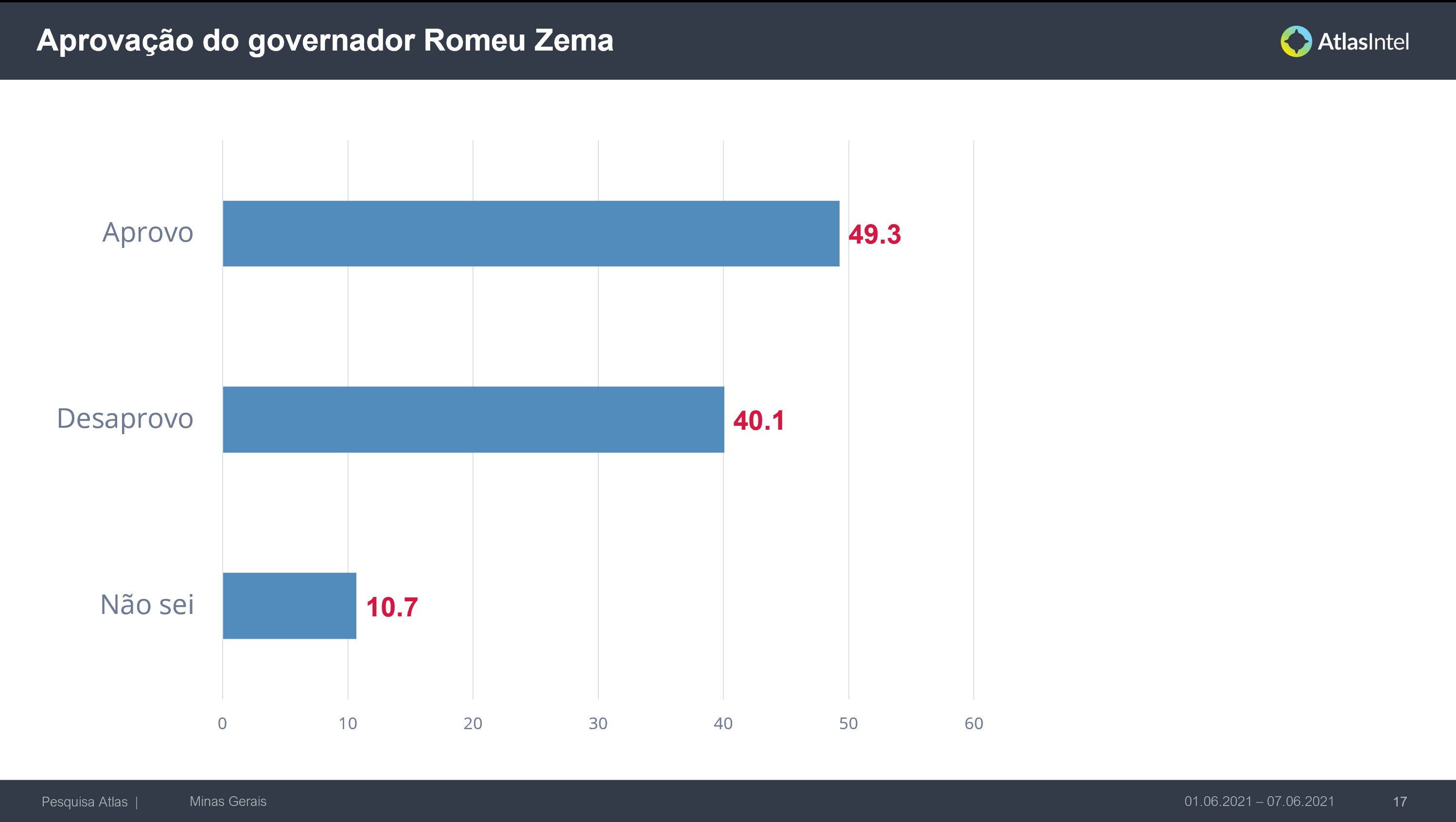 A pesquisa também mediu a aprovação de Bolsonaro, eleito presidente do Brasil em 2018. Ele é desaprovado dos 61,4% dos mineiros ouvidos e aprovado por 36,9%. Um restante de 1,7% não soube opinar a respeito.