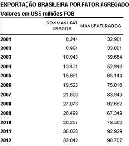 Mas o Brasil jamais deixou de exportar produtos industrializados, e as exportações destes não parou de crescer. Registraram um baque em 2009, por causa da profunda crise financeira vivida no mundo em 2008, mas já se recuperaram. E triplicaram nos últimos 12 anos. Em 2001, o Brasil exportou US$ 32,9 bilhões em produtos manufaturados e US$ 8,23 bilhões em semimanufaturados. Em 2012, exportamos US$ 90,7 bilhões em manufaturados e US$ 30,0 bilhões em semimanufaturados.