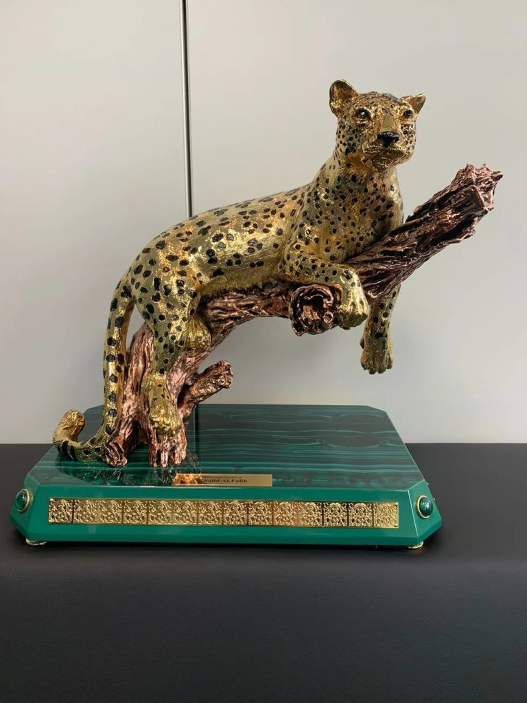 Durante a visita de uma comitiva saudita ao Brasil, composta por mais de 70 representantes das principais empresas públicas e privadas do país, o ministro de Investimento, Khalid Al Falih, presenteou Haddad com a peça. O valor da onça de ouro ainda não foi avaliado.