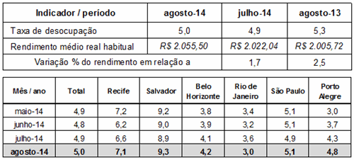 A taxa de desocupação em agosto de 2014, foi estimada em 5,0% para o conjunto das seis regiões metropolitanas investigadas. Frente a julho (4,9%) e também a agosto de 2013 (5,3%) a taxa não apresentou variação estatisticamente significativa. Essa foi a menor taxa para um mês de agosto em toda a série da pesquisa, iniciada em março de 2002.