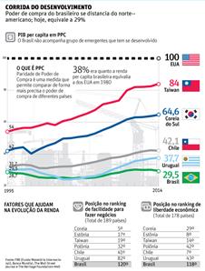 O Brasil voltou a ficar estagnado na sua trajetória rumo ao desenvolvimento econômico, na contramão de um grupo de países emergentes de diferentes regiões que continua avançando para um nível de renda mais elevado, como Chile, Uruguai, Coreia, Taiwan, Polônia e Estônia.