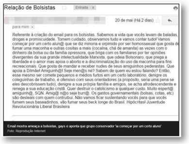 Um mês antes do homicídio, um email enviado ao estudante e amigos cheio de ameaças, assinado por um grupo intitulado Juventude Revolucionária Liberal Brasileira.
