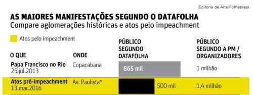 Nos protestos do dia 18 de março, em favor do governo Dilma, ao contrário, a PM avaliará o número de manifestantes em 80 mil, número 4.3 vezes menor que o informado pelos organizadores, 350 mil.