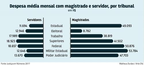 O custo mensal por Magistrado do Poder Judiciário em 2016 foi de R$ 47,703 mil, R$ 13,7 mil por servidor, R$ 4 mil por terceirizado e R$ 871 por estagiário. Os Magistrados custaram na Justiça Estadual R$ 49,093 mil, Justiça do Trabalho R$ 38,819 mil, Justiça Federal, de R$ 50,876 mil, Justiça Militar, de R$ 53,784 mil, Tribunais Superiores, de R$ 41,502 mil e Justiça Eleitoral, de R$ 8,782 mil. O menor custo da justiça eleitoral deve-se ao fato de que os juízes acumulam jurisdição e recebem da justiça eleitoral apenas a gratificação pela atividade. A remuneração efetiva destes magistrados é paga pelo órgão de origem.