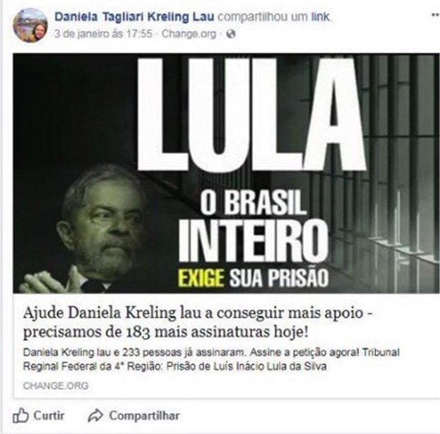 E a violência simbólica tem até coadjuvante, como a funcionária do TRF-4 — nada mais, nada menos que a chefe de gabinete da Presidência do TRF, que, em sua página pessoal, pede a prisão de Lula e busca assinaturas de apoio. Inacreditável? Pois veja abaixo. Sim, não nego o direito de a servidora expressar sua vontade e opinião pessoal. Mas ao assumir esse cargo, alguns ônus se lhe impõe. Vejam no post que ela “invoca” o TRF-4 no “nome da petição”. Imaginem nos Estados Unidos alguém do gabinete do presidente de um tribunal torcer (vibrar) e colher assinaturas de apoio à condenação de um réu. E de sua prisão. Mormente se o réu for ex-presidente da República. Imaginem na Alemanha. Ou na Espanha. Tenho contatos em Burkina Faso — liguei para lá e perguntei: nem lá isso seria admitido. Então: