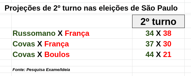 Na sondagem divulgada hoje, França venceria um segundo turno contra Russomano por 38 X 34; contra Covas, o placar seria de 37 X 30 em favor do prefeito. No caso de um segundo turno entre Covas e Boulos, porém, o tucano ganharia com uma vantagem de 23 pontos.