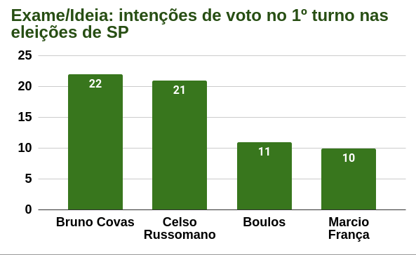 De qualquer forma, o primeiro turno ainda sinaliza uma disputa final entre Covas e Russomano, ambos empatados com 22% a 21%. Boulos e França, por sua vez, seguem empatados, com 11% e 10%.