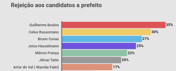 Essa dificuldade de Boulos está ligada à sua rejeição, que é a maior de todos os candidatos, segundo a mesma pesquisa, 35%. O segundo candidato mais rejeitado é Russomano, com 30%, seguido de Covas, com 27%, Joyce, com 25%, e Marcio França, com 22%.